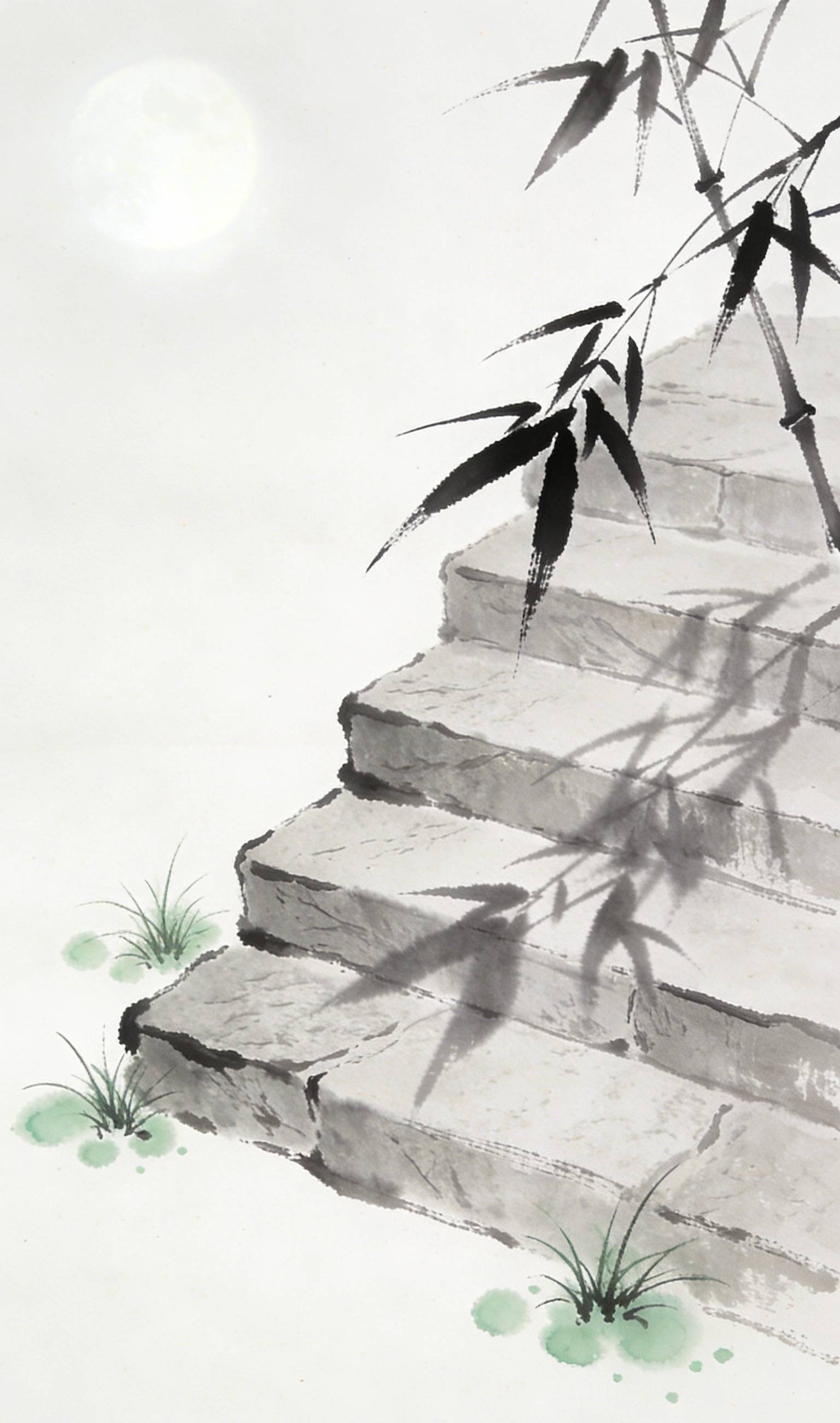 整幅画没什么人,也没什么故事,却处处都是人的影子。你会忍不住想,是谁曾在这台阶上走过?是深夜归家的旅人,还是月下独酌的隐士?竹影摇曳,月光如水,连风都好像放慢了脚步。