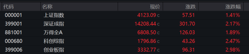 沪指高开0.93%,深成指高开1.50%,创业板指高开1.95%,科创综指高开1.99%。